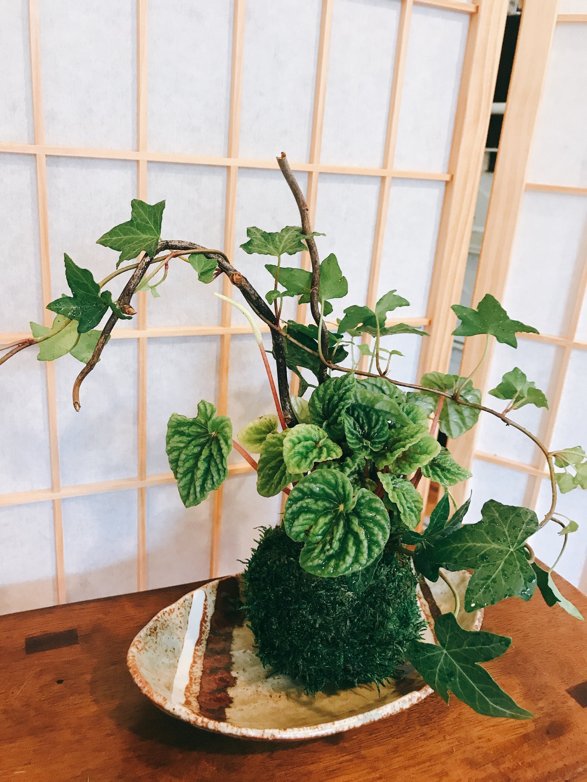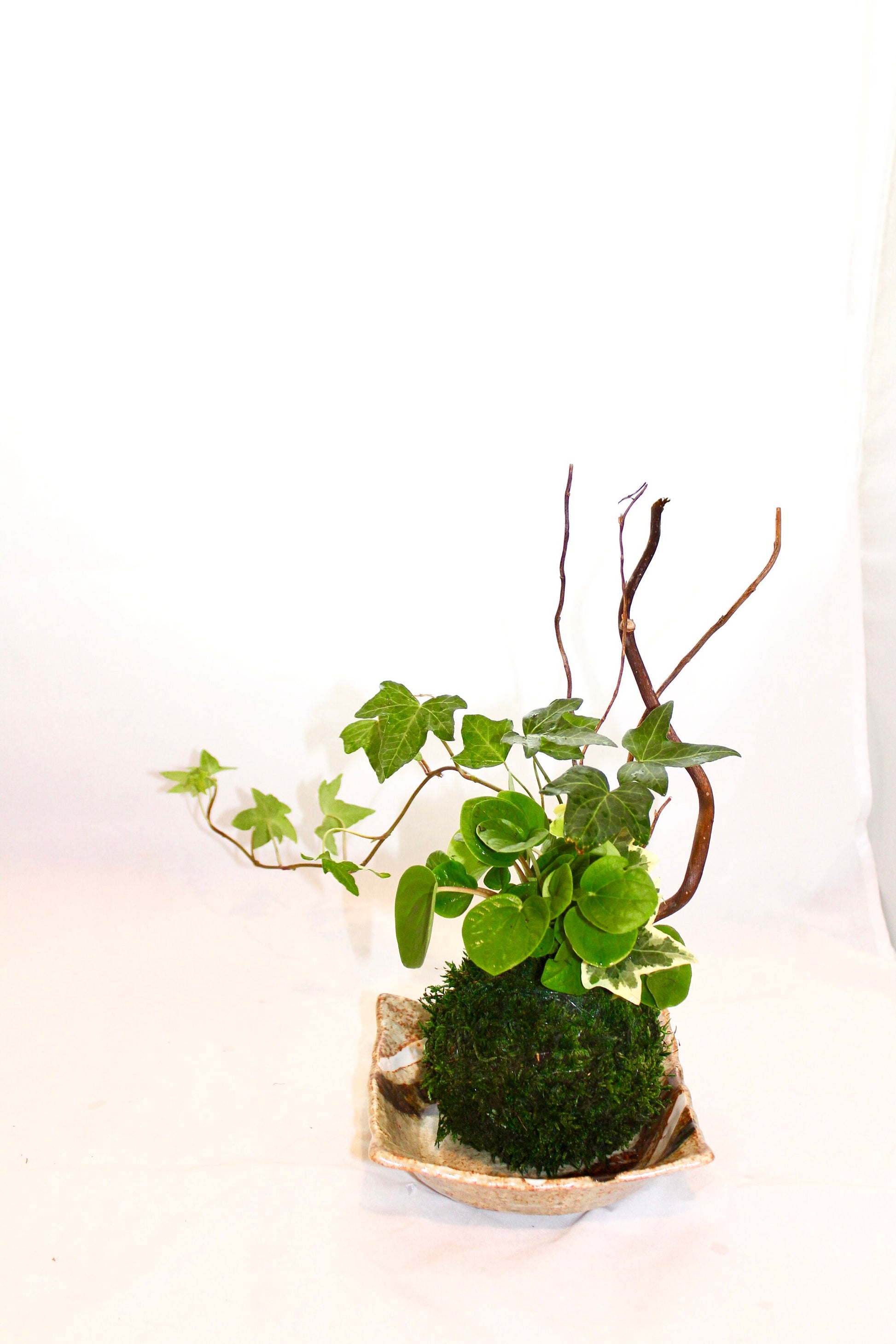 Arranged Kokedama with ripple peperomia and ivy, Japanese traditional indoor moss ball garden
