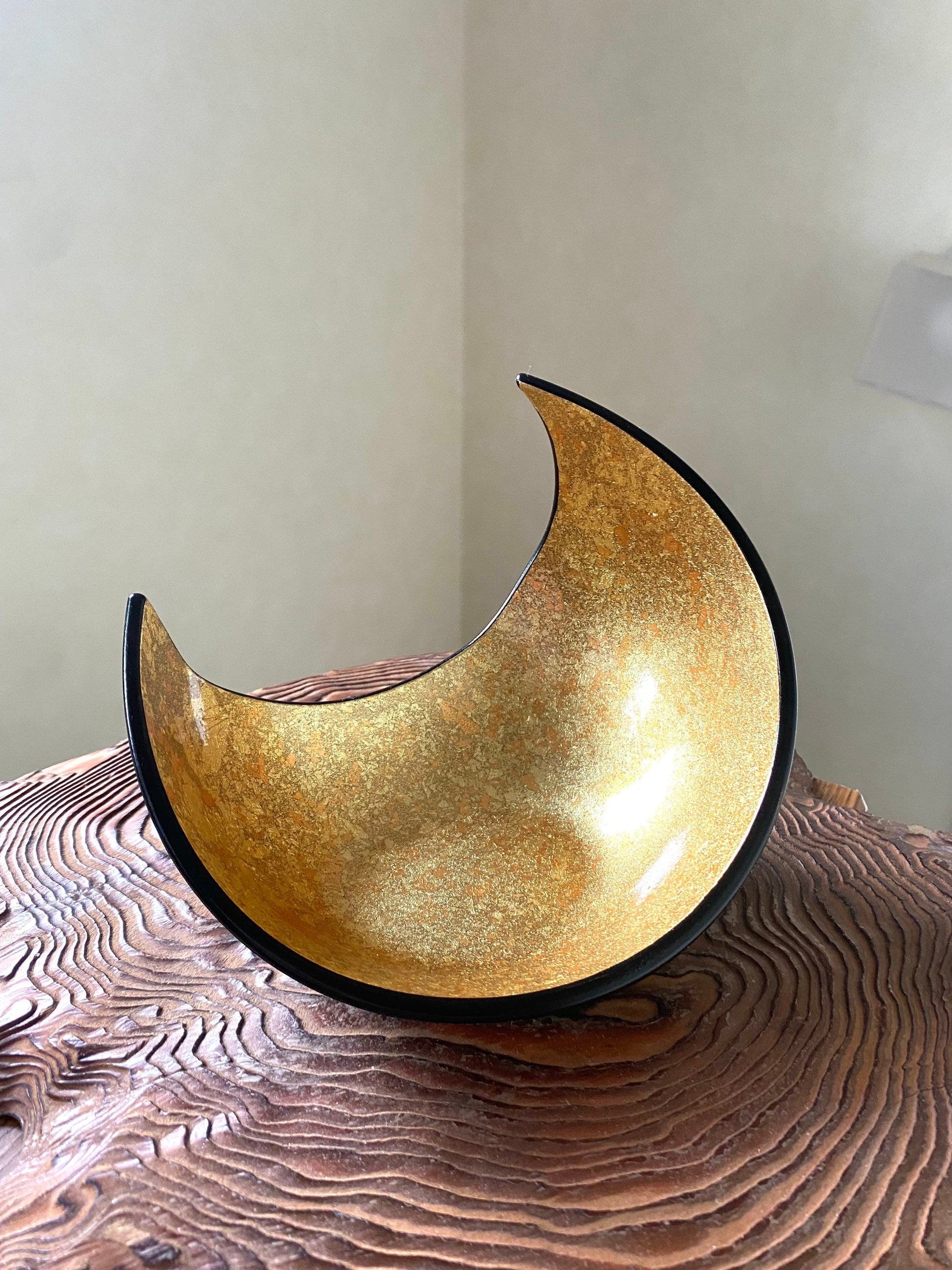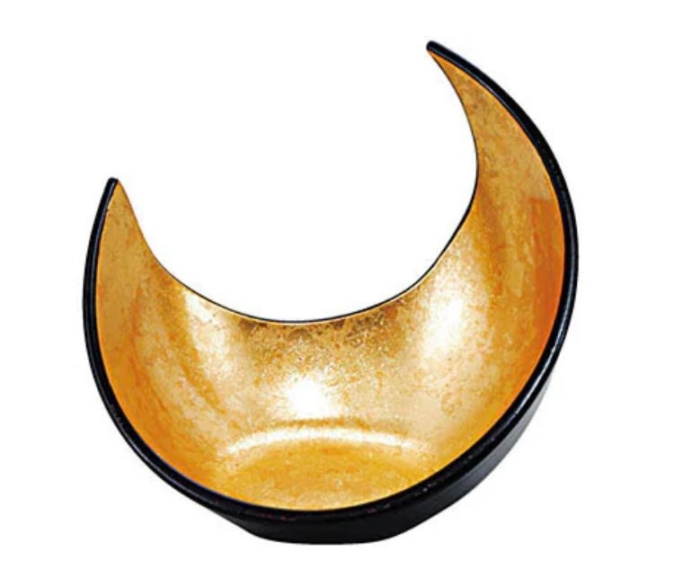 Japan made, beautiful gold half moon shape kokedama saucer, gold inside , black outside, grazed. It is good saucer for, small Kokedama.