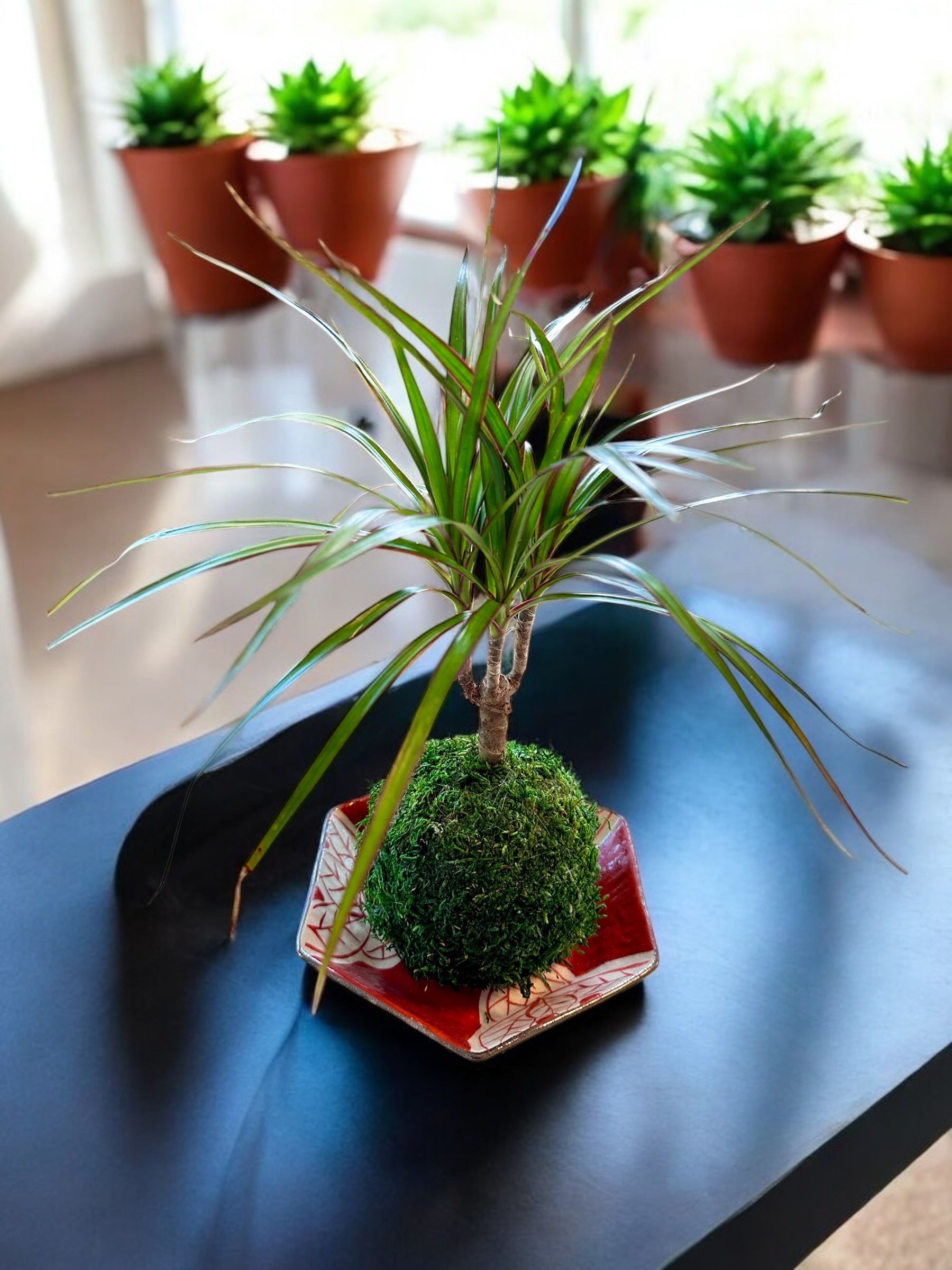 Beautiful dark red color enhanced Kokedama beauty.