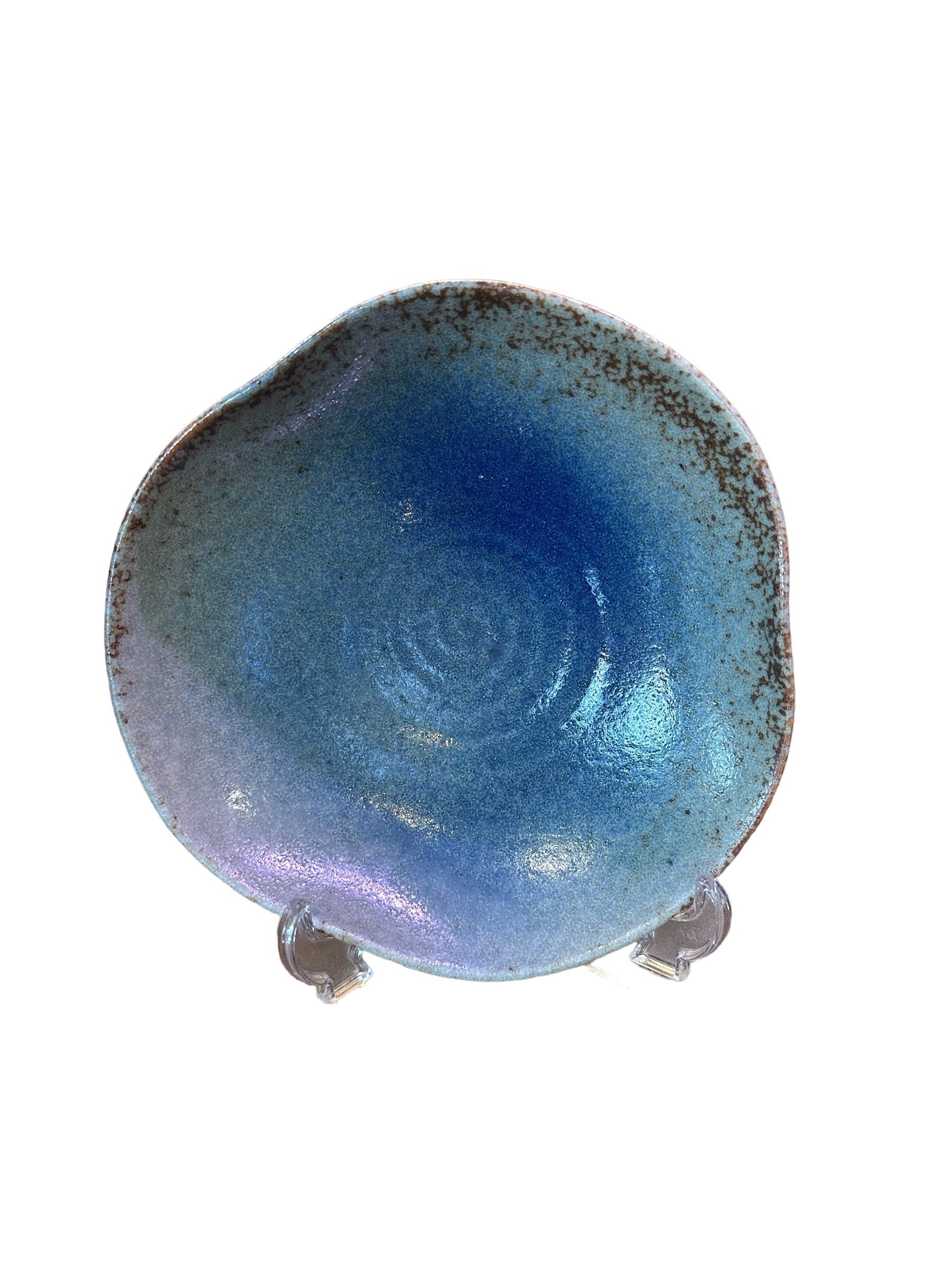 Gradation of blue and the brownish rim makes it by different temperature when it was in the kiln.