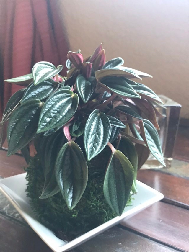 Peperomia caperata “Rosso” Kokedama, Japanese botanical art, indoor moss ball garden