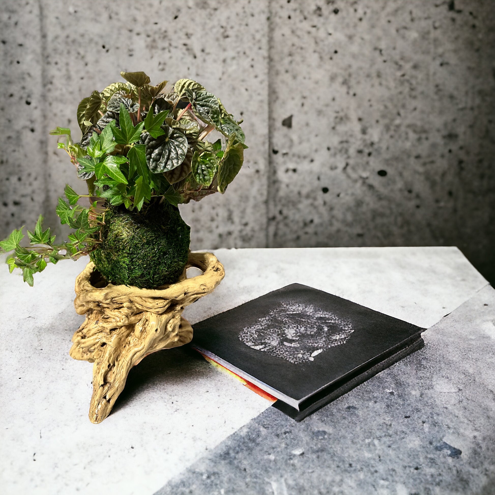 Purple Ripple peperomia and ivy arranged Kokedama - Moss ball, Japanese ancient botanical technique.
