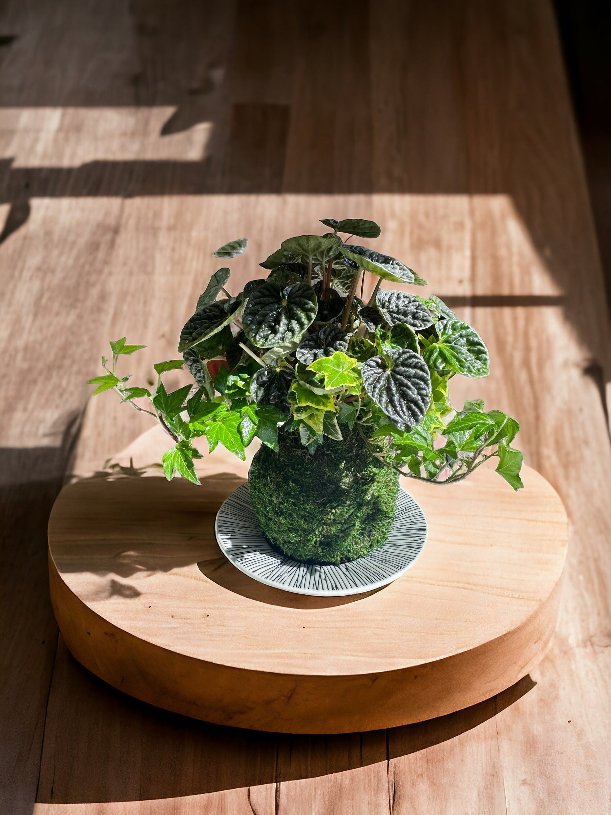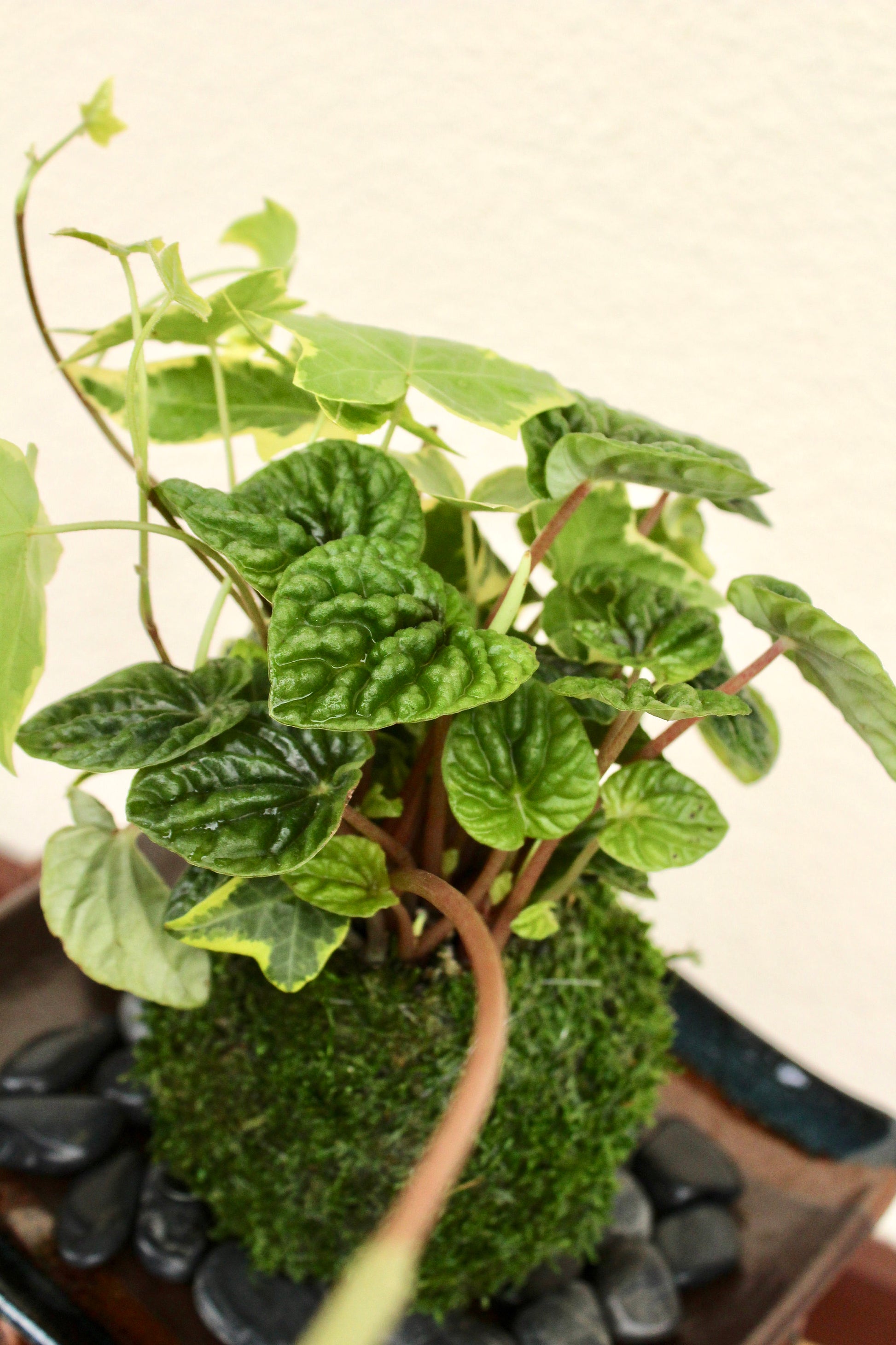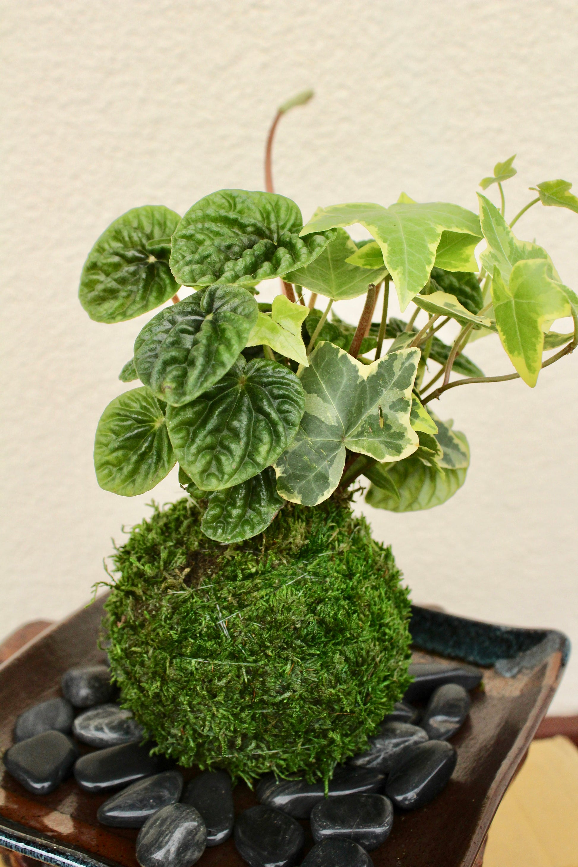 Ripple peperomia and ivy arranged Kokedama - Moss ball, Japanese ancient botanical technique.