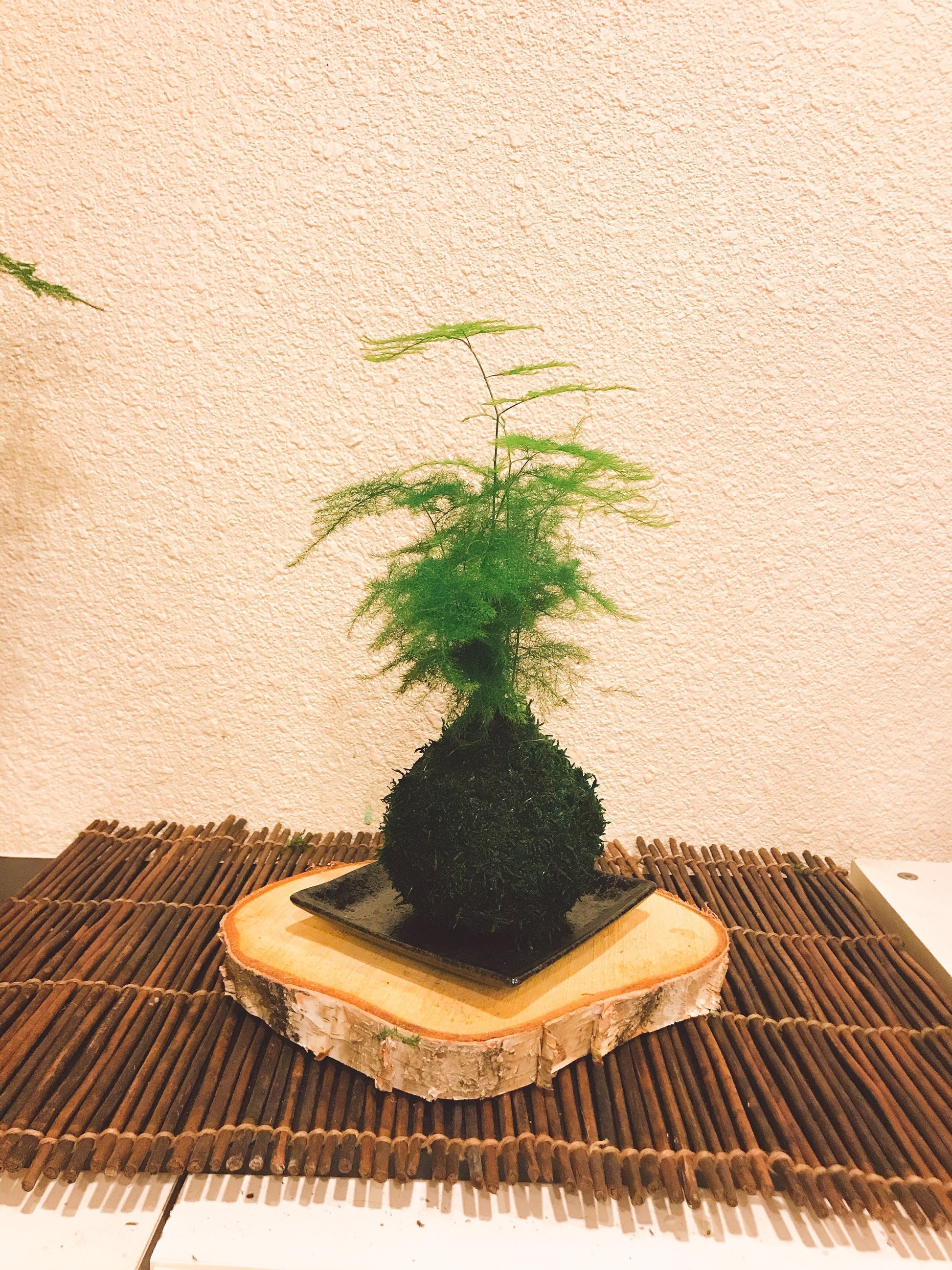 Small Asparagus fern Kokedama - Bonsai Moss ball. Attractive herbaceous, lace-like foliage perennial plant.