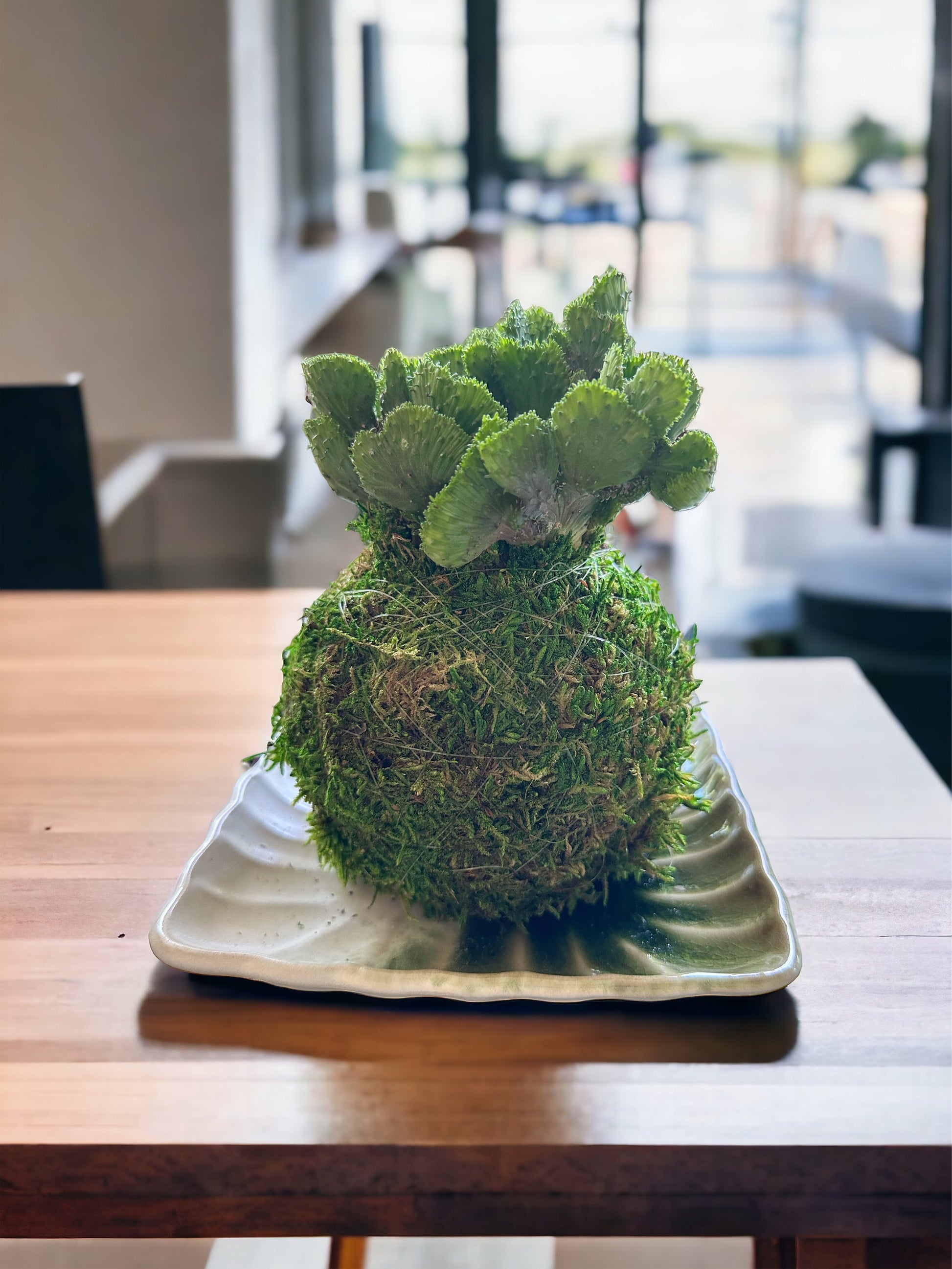 Crafted with care, this saucer features a captivating spray-glazed flower design adorning the inner dish. Vibrant green hues merge seamlessly with earthy brown tones, creating a stunning, glass-like appearance that enhances the natural beauty of your Kokedama plants.