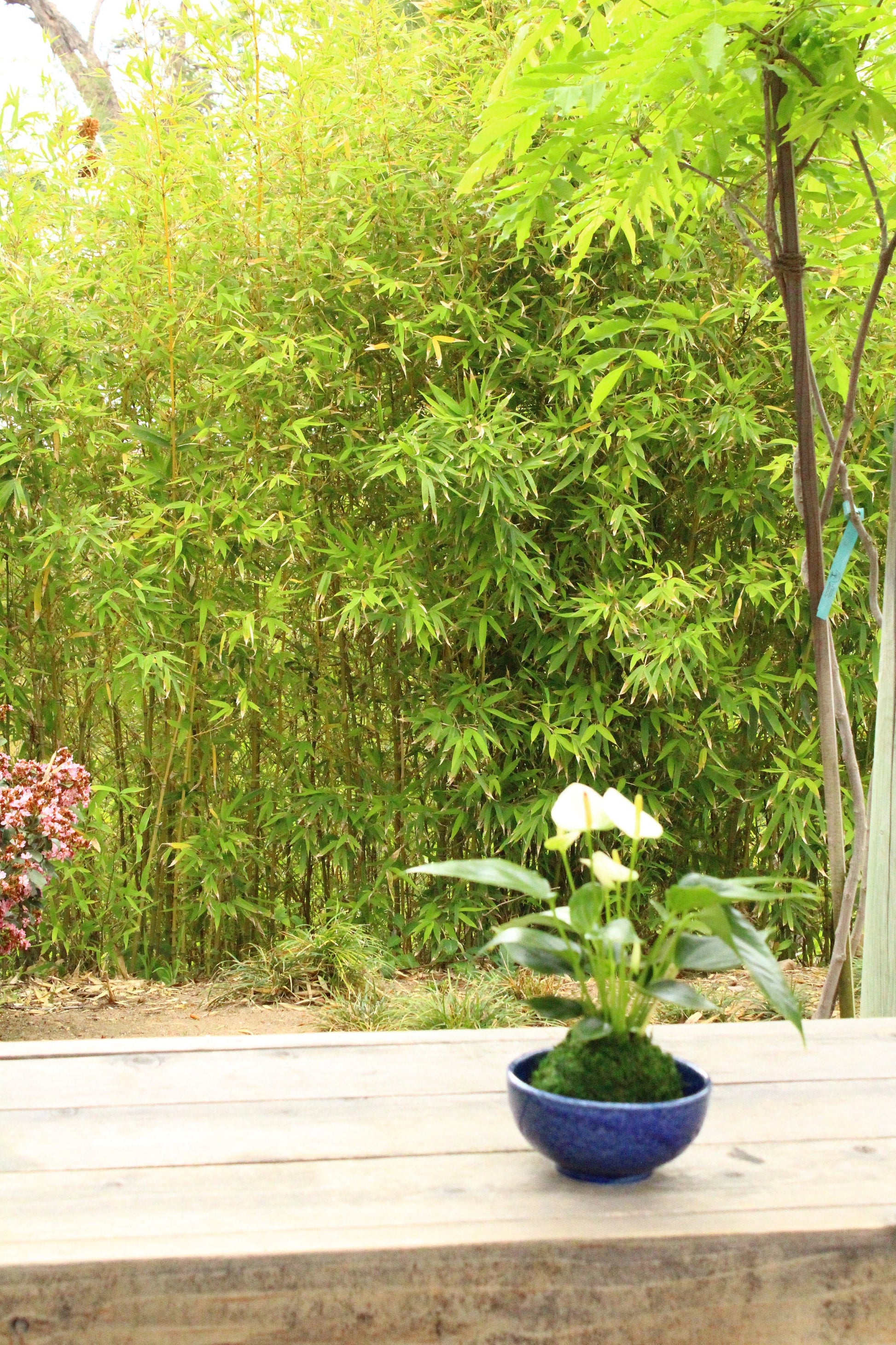 White Anthrium Kokedama - Moss ball, Japanese ancient botanical technique.