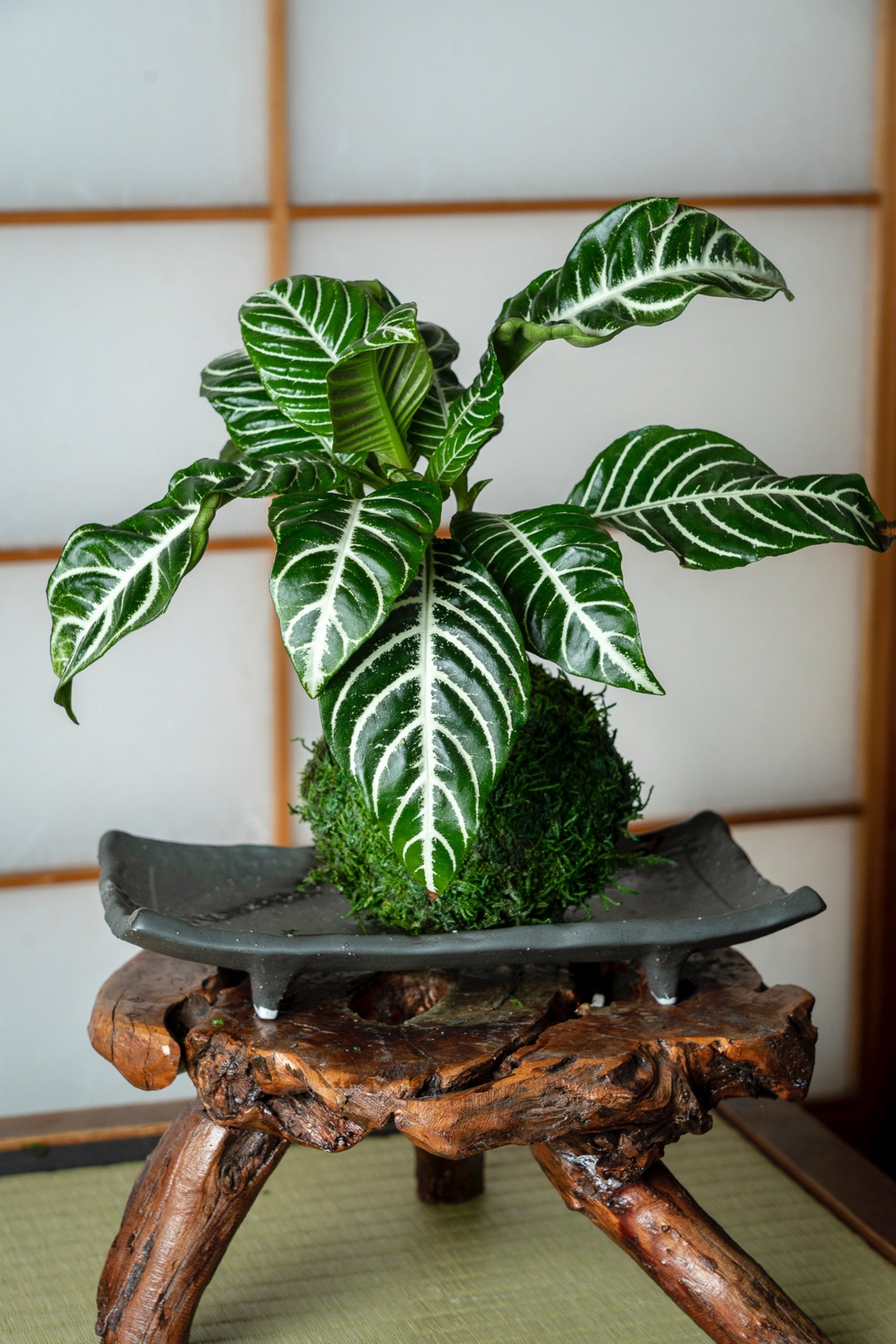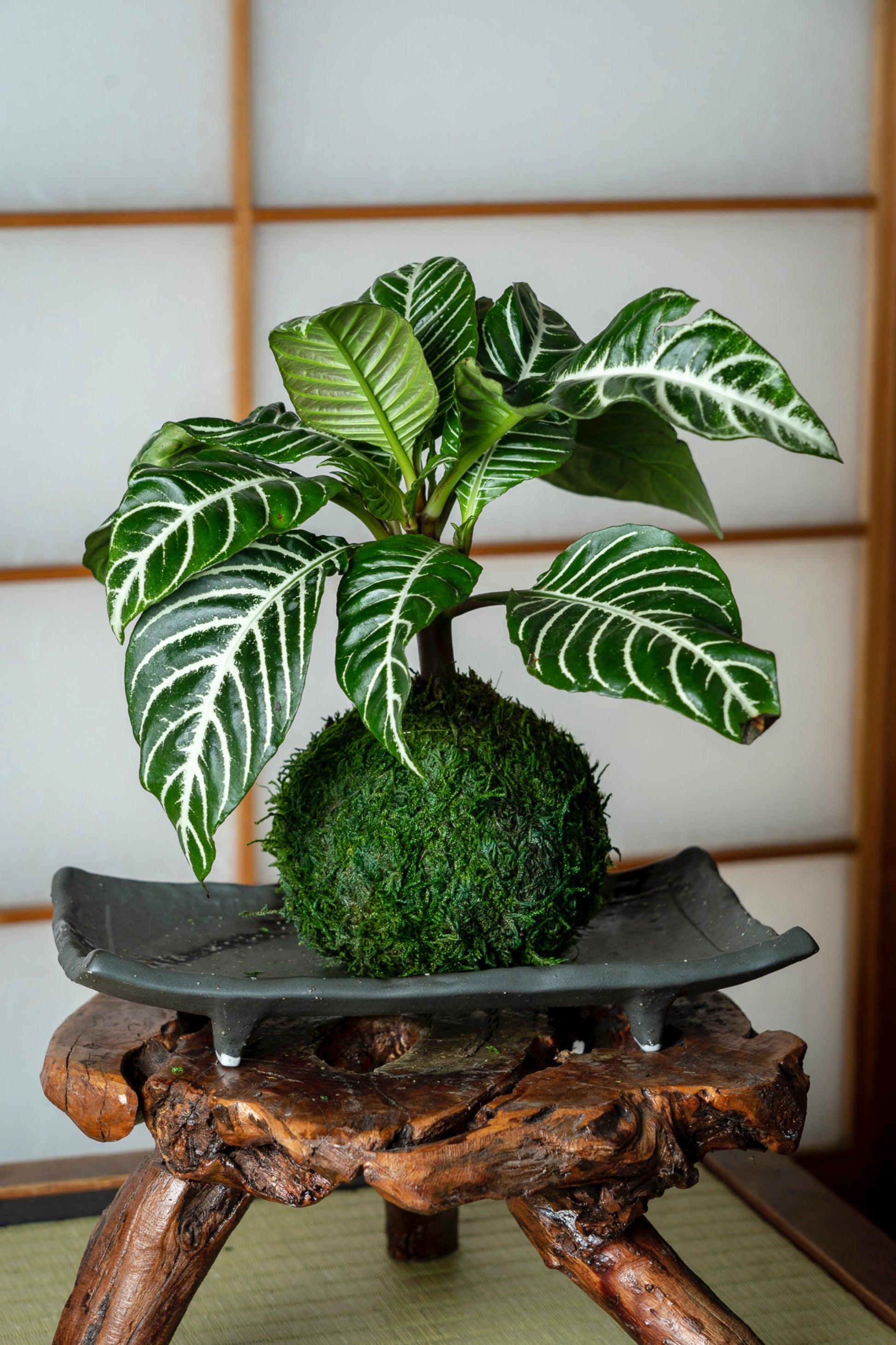 Zebra plant kokedama, mossball, Japanese traditional indoor garden technique.